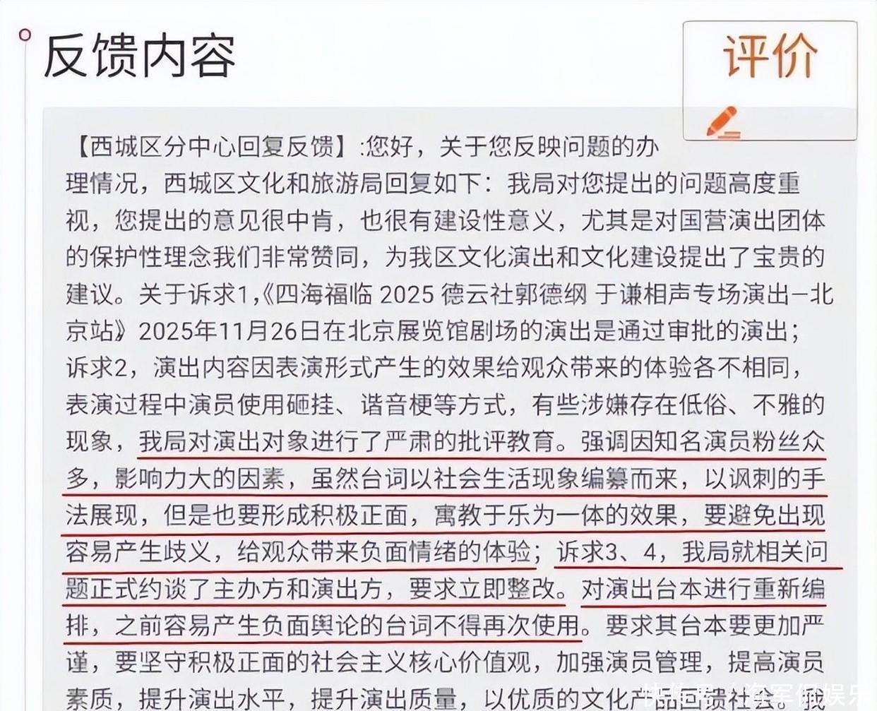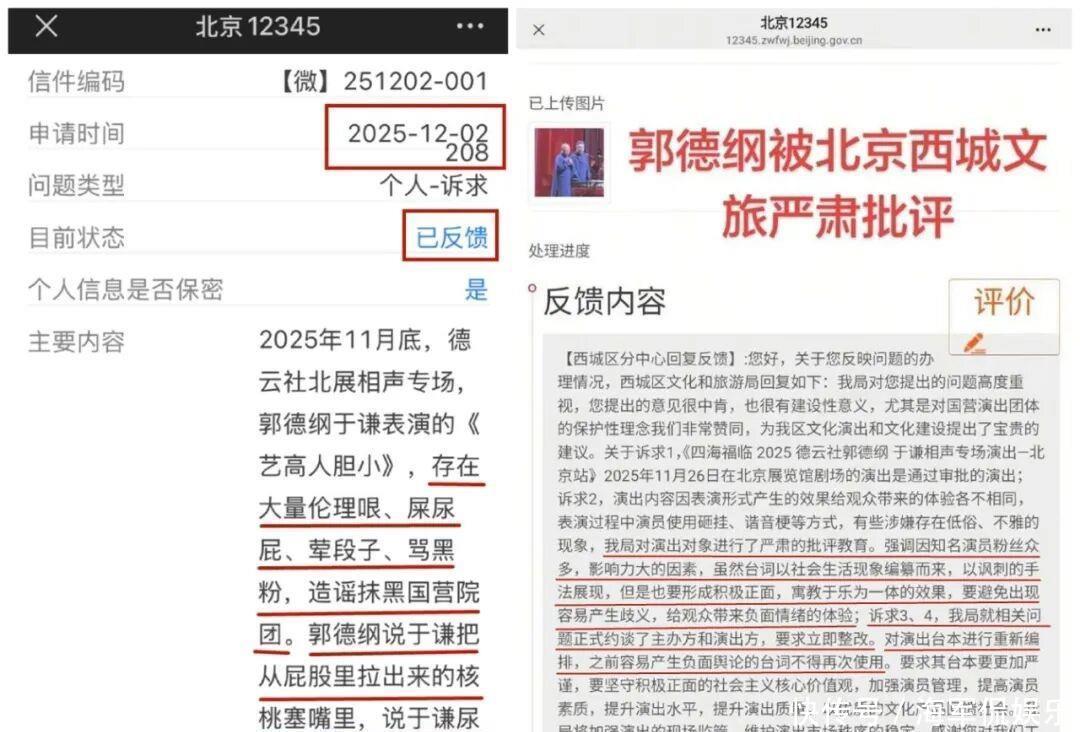 11月26号,郭德纲和于谦在北京北展剧场搞了一场相声专场。12月2日,那部叫《艺高人胆小》的作品因为充满不少伦理笑料,屎尿屁段子,黄段子,还骂黑粉,造谣抹黑国营院团啥的,被举报了。12月4日,西城区文化和旅游局做出回应,,对表演的相关人员进行了认真严肃的批评教育,还正式和主办单位以及演出方谈话,明确要求他们立刻整改。12月6日,那张举报截图开始在网上传播开来,迅速引发了网友们的热议。